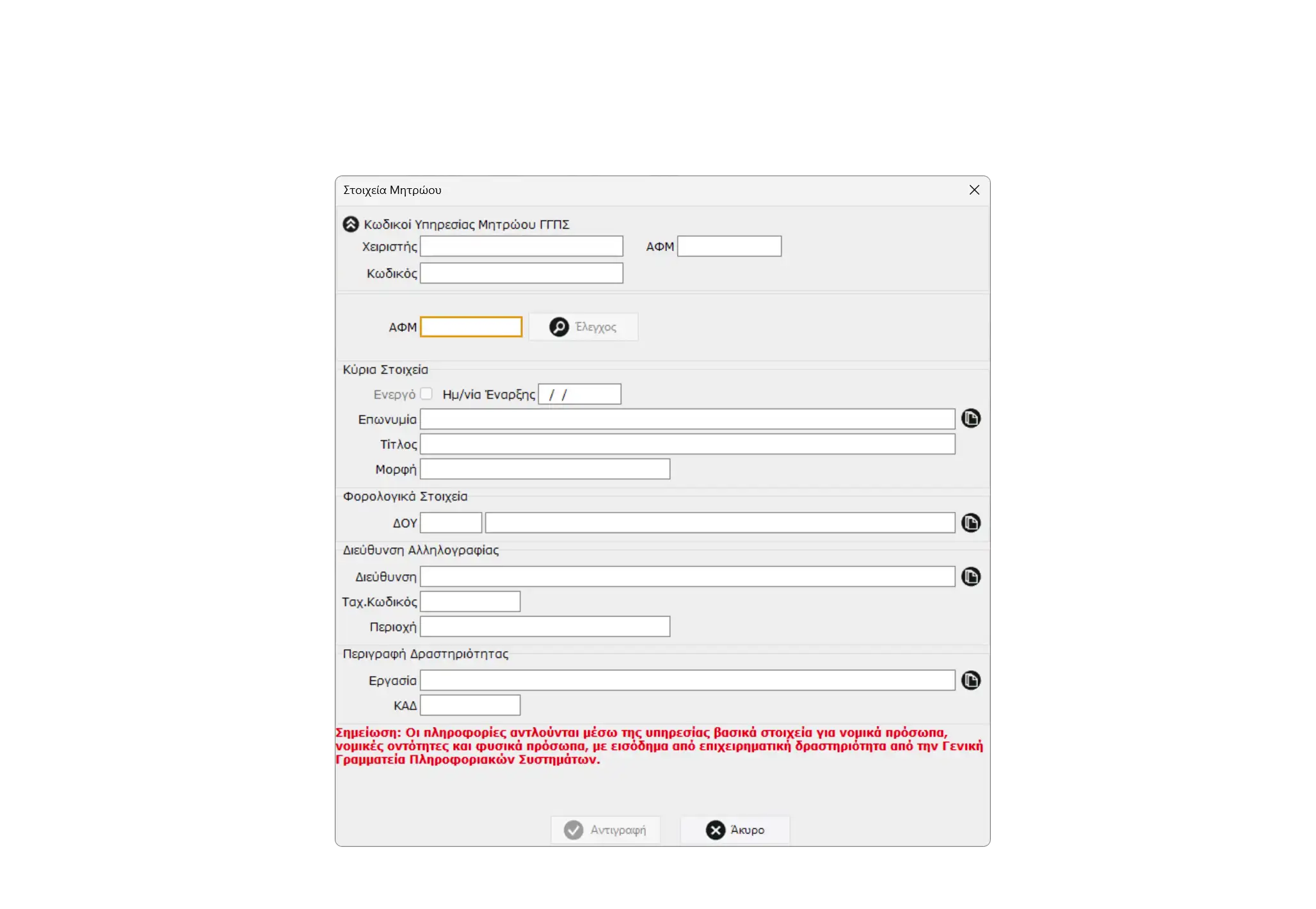 - Αυτόματη εύρεση στοιχείων μέσω ΑΦΜ με σύνδεση στη ΓΓΠΣ & VIES, για γρήγορη και αξιόπιστη δημιουργία εγγραφών