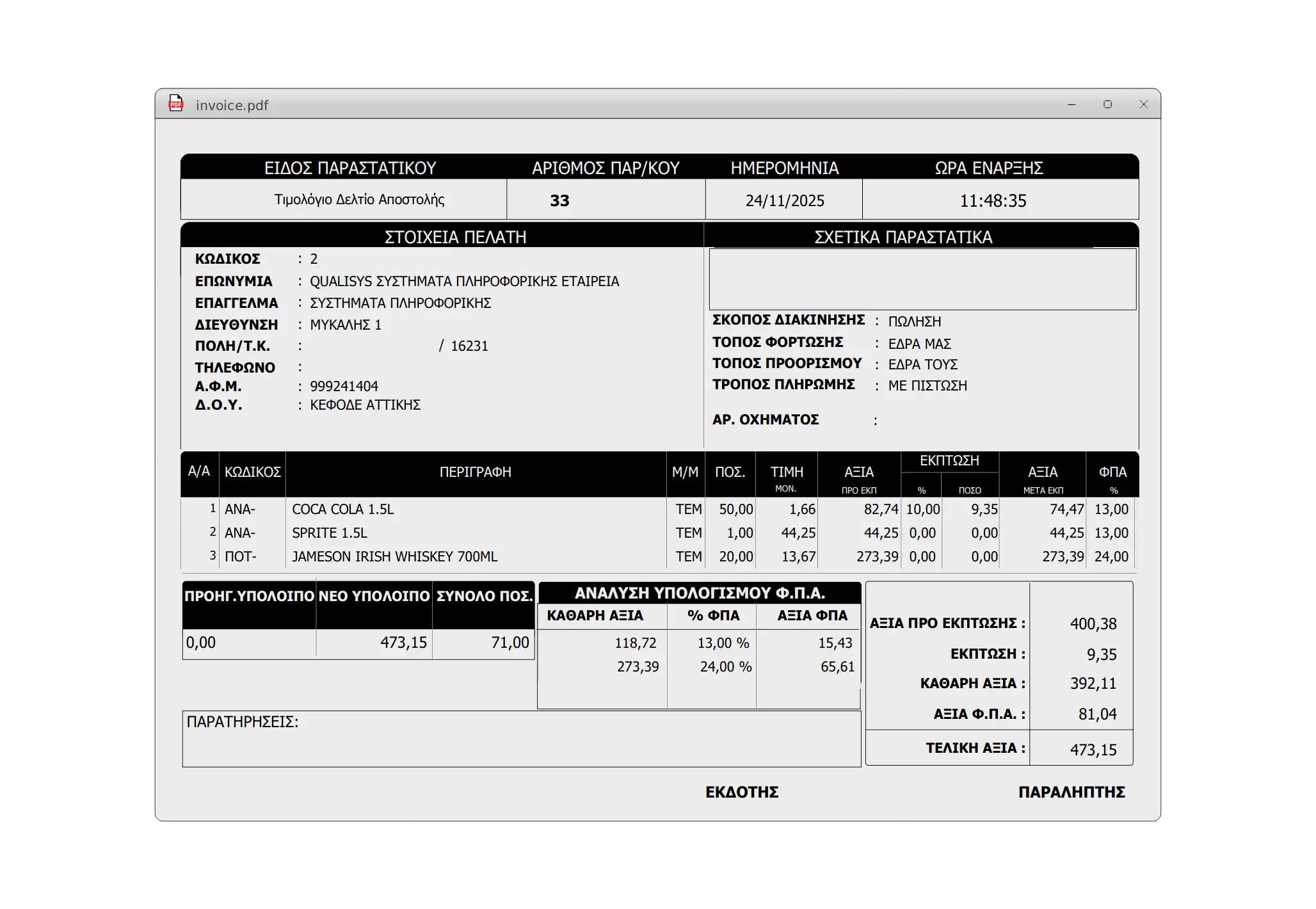 - Υποστήριξη έκδοσης κάθε τύπου παραστατικού (Τιμολόγιο, Δελτίο Αποστολής, Απόδειξη κ.ά.)