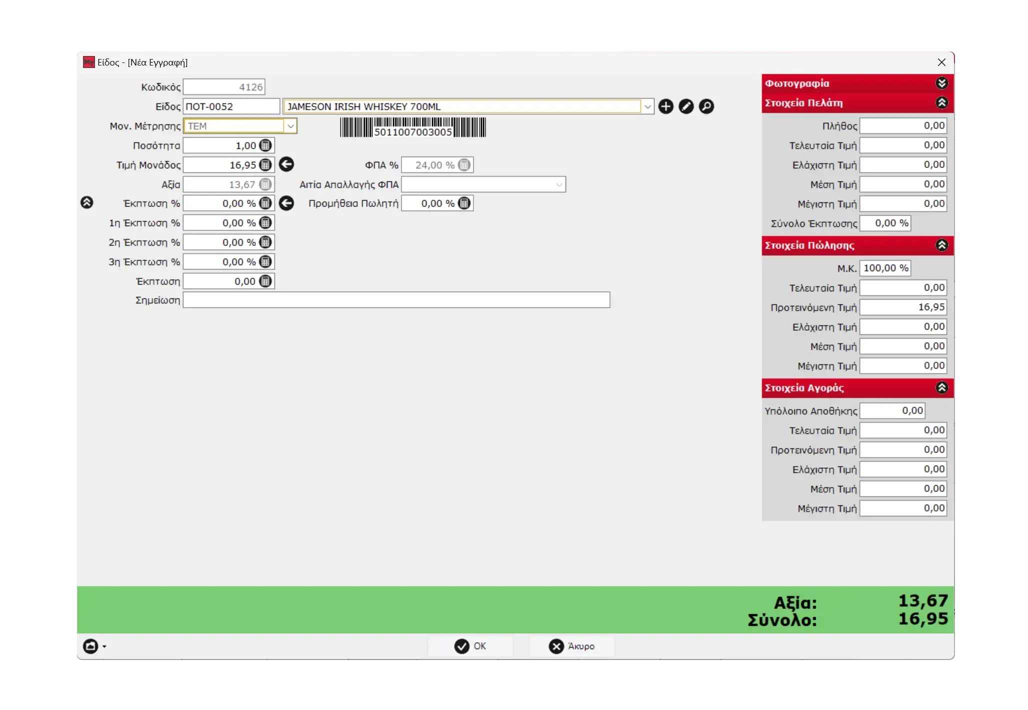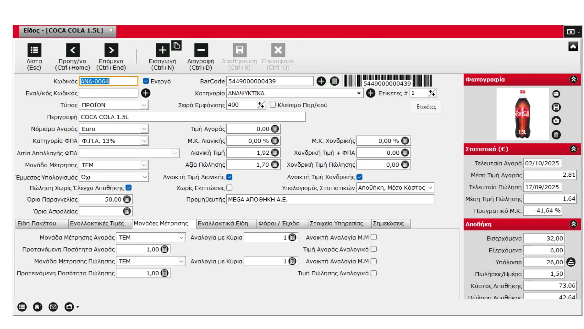 - Πλήρης διαχείριση ειδών με πεδία όπως κωδικός, barcode, εναλλακτικό κωδικό, περιγραφή, τιμές και φωτογραφία προϊόντος