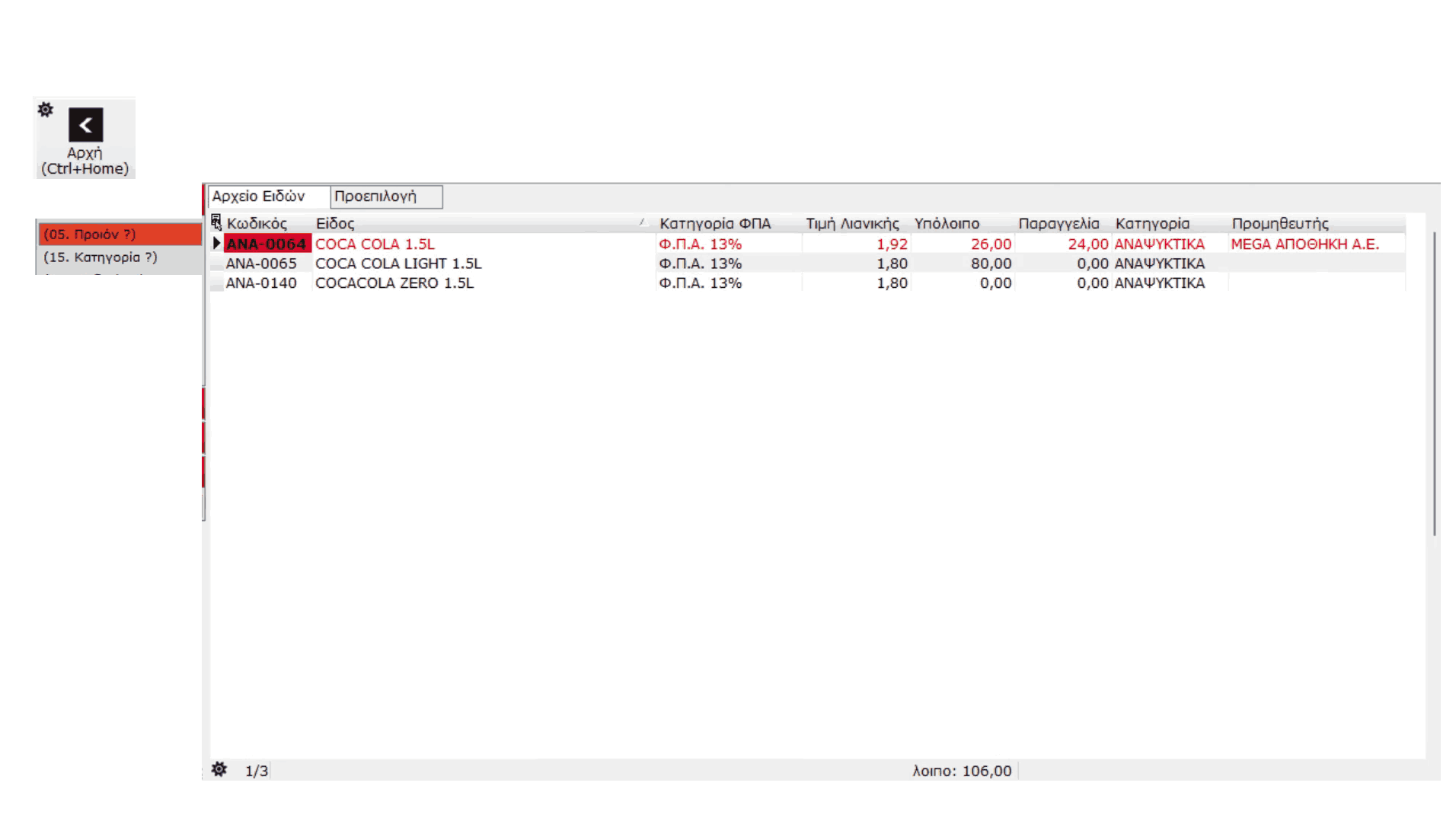 - Γρήγορη αναζήτηση ειδών με βάση όνομα, barcode ή κατηγορία