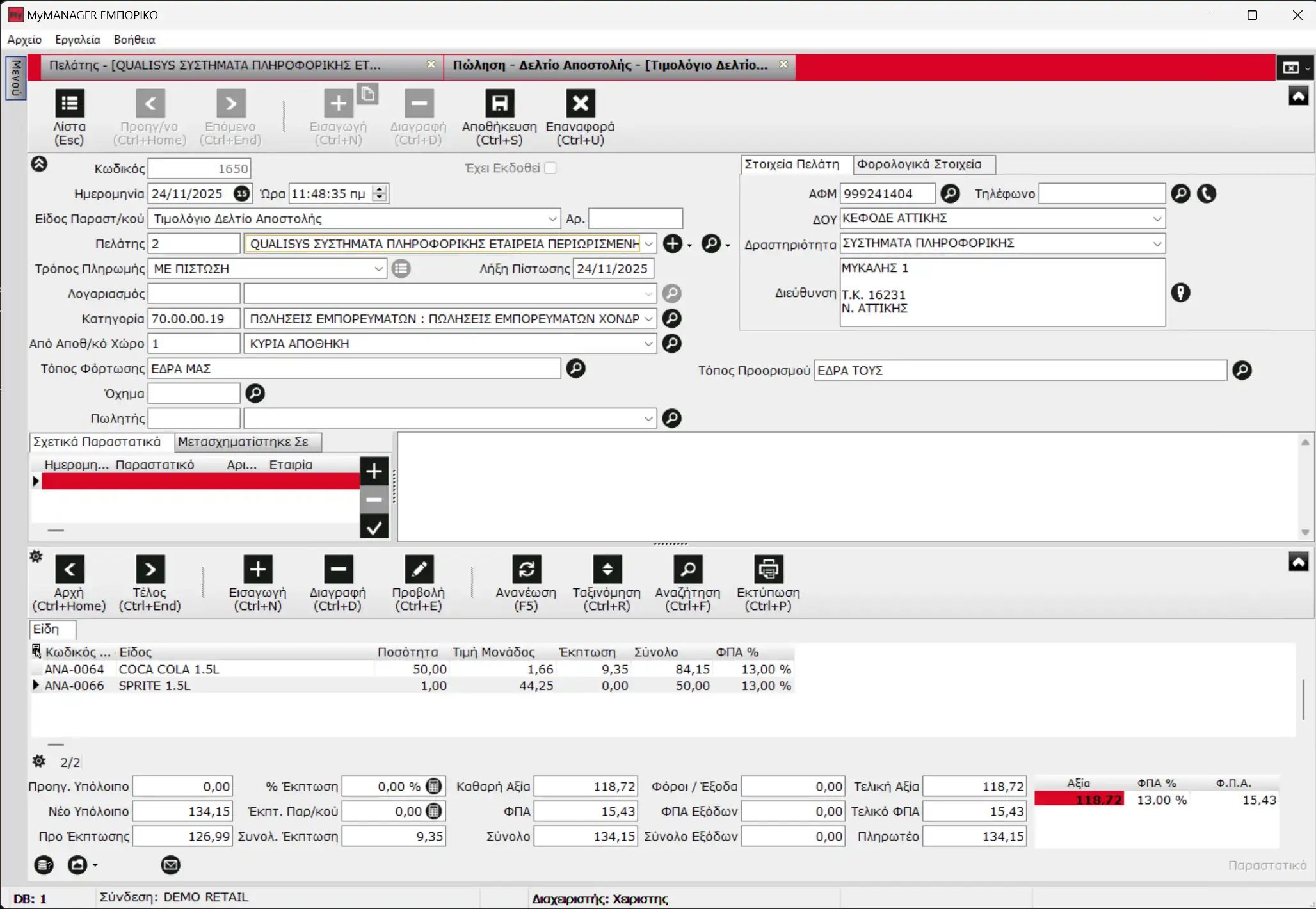 - Υποστήριξη έκδοσης κάθε τύπου παραστατικού (Τιμολόγιο, Δελτίο Αποστολής, Απόδειξη κ.ά.)